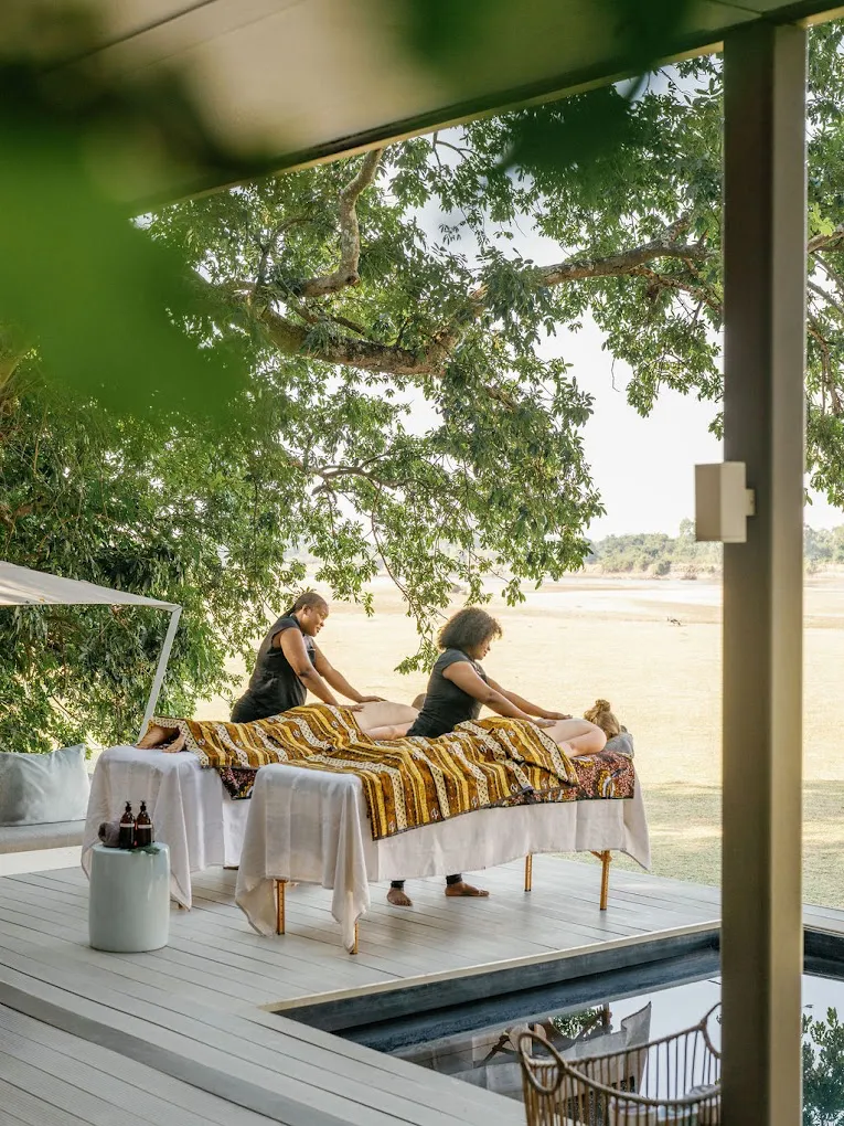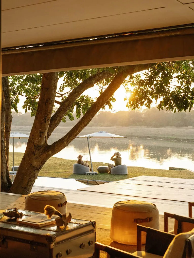 Dining at Chinzombo is stylish yet relaxed, anchored around an open-air dining and bar pavilion tucked among riverine trees. Meals draw on fresh, locally sourced produce, and are often enjoyed beside the river or under the stars. The communal fire-pit on the bluff above the river offers a scenic atmosphere for sundowner drinks or evening meals. For a personal touch, the lodge also offers in-villa spa treatments or romantic dinners on your private deck overlooking the water.