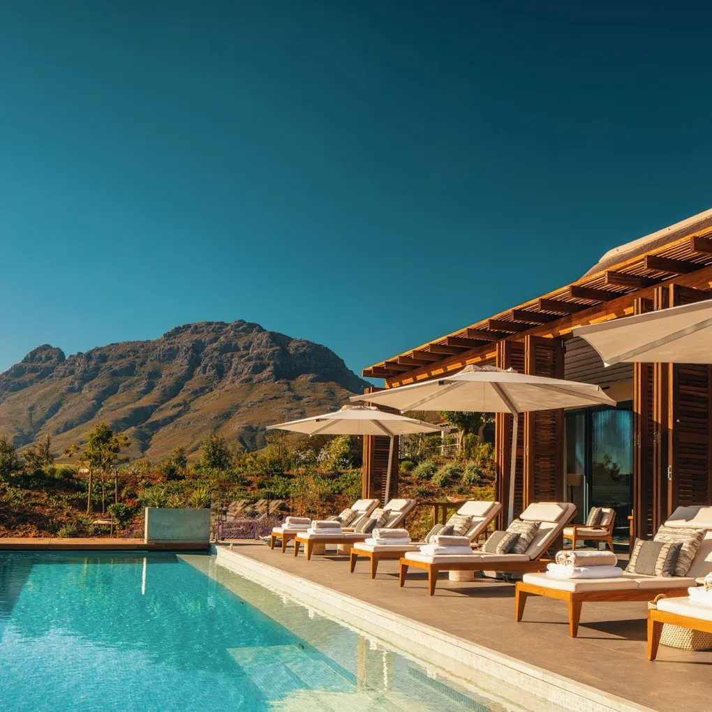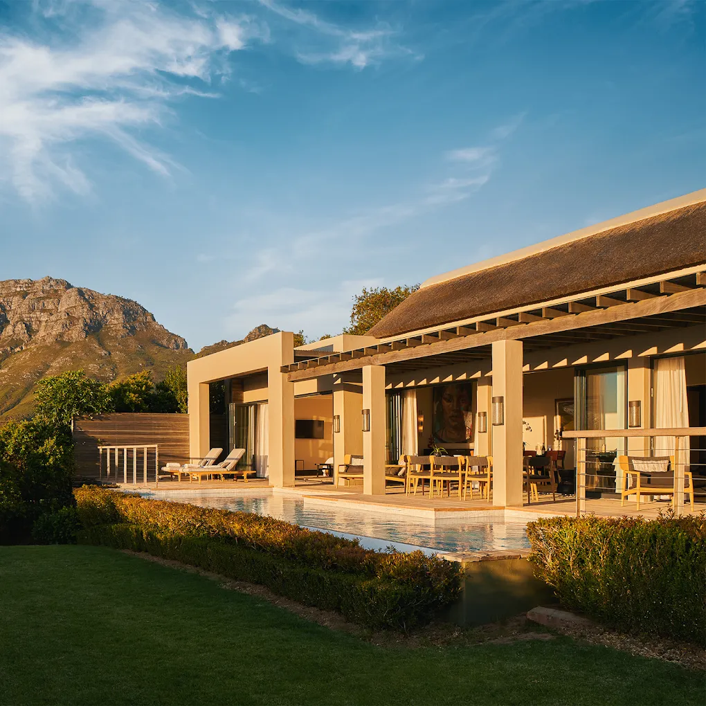 Set on a historic mountain pass overlooking the Stellenbosch Valley, Delaire Graff Lodge & Spa is a celebrated wine estate owned by jeweller Laurence Graff, designed to reflect his passion for art, design and fine craftsmanship. The estate combines contemporary architecture with beautifully landscaped gardens filled with sculptures and indigenous plants, creating a setting that feels both elegant and dramatic. With its elevated position, panoramic views stretch across vineyards and mountains, making the property one of the most iconic destinations in the Cape Winelands. The estate is also renowned for its award-winning wines and refined hospitality, offering a seamless blend of luxury, culture and natural beauty.