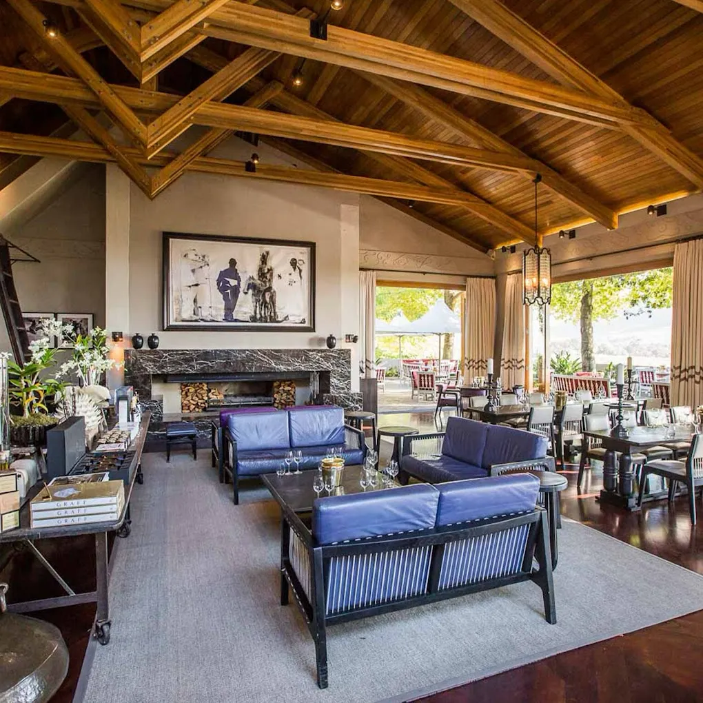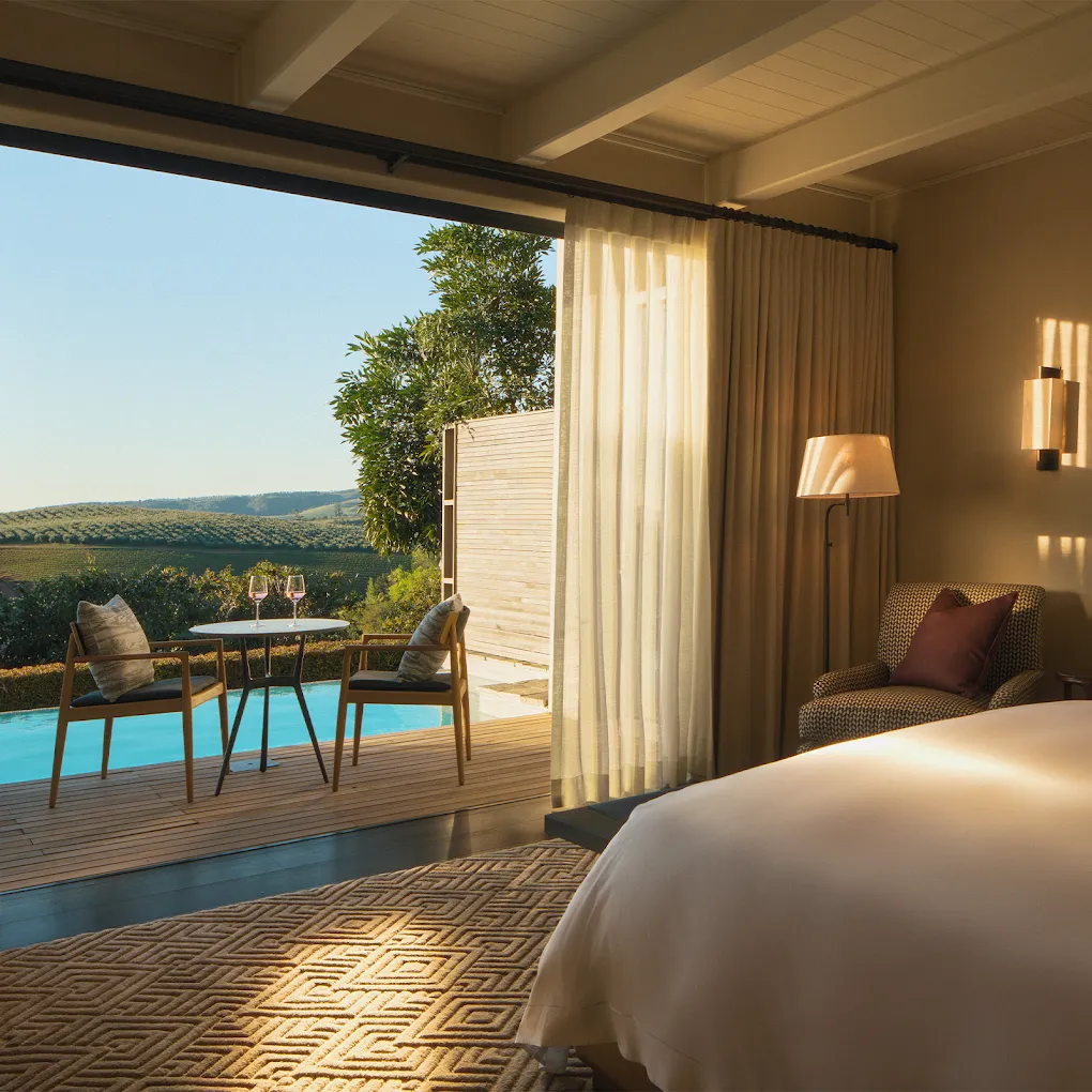 Accommodation at Delaire Graff Lodge & Spa consists of spacious, private lodges and villas designed to maximise comfort and privacy. Each lodge features expansive living areas, floor-to-ceiling windows and private terraces with heated plunge pools that overlook vineyards and mountain scenery. Interiors are richly detailed with bespoke furnishings, curated artwork and luxurious finishes, creating elegant spaces that feel both contemporary and deeply connected to the surrounding landscape.