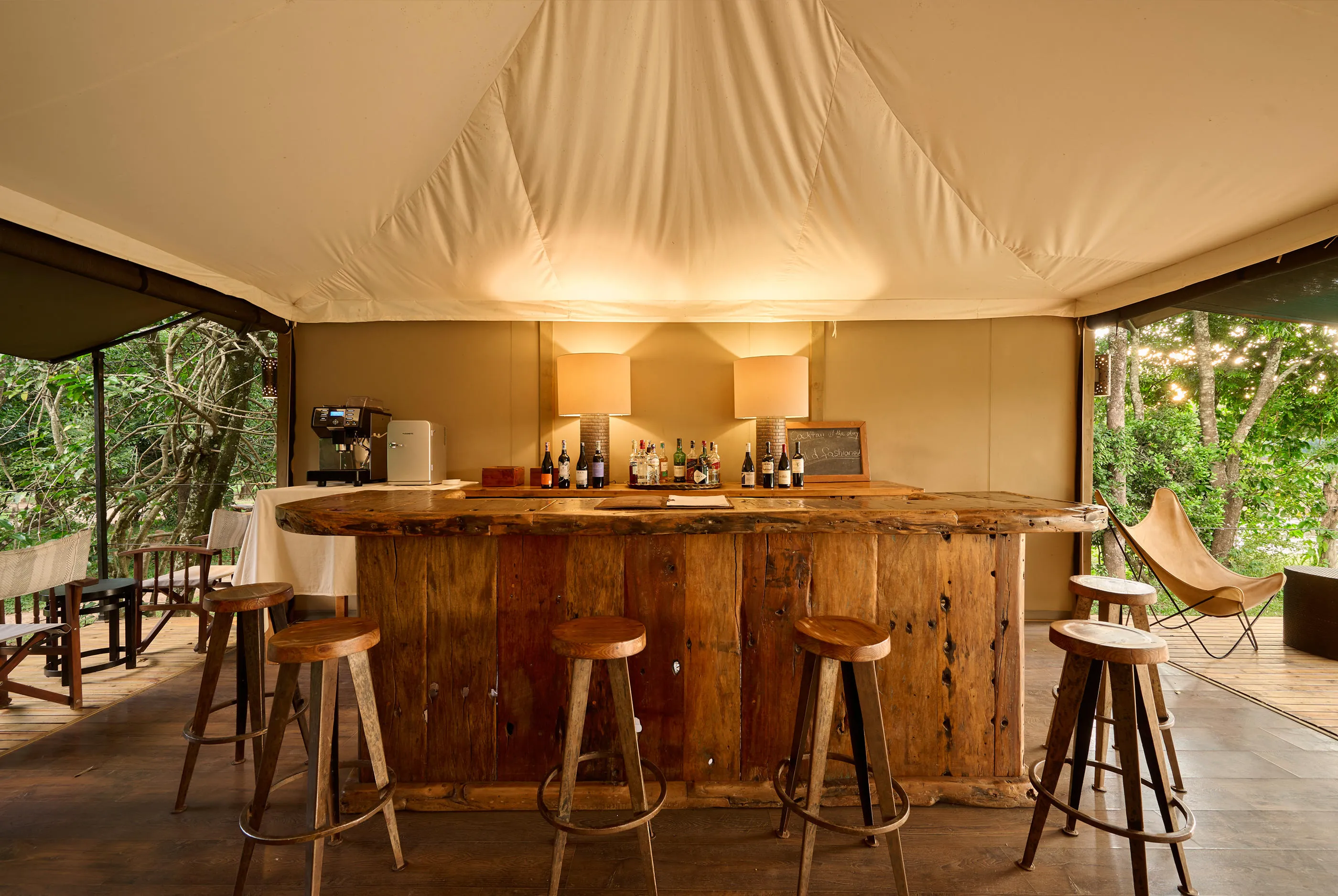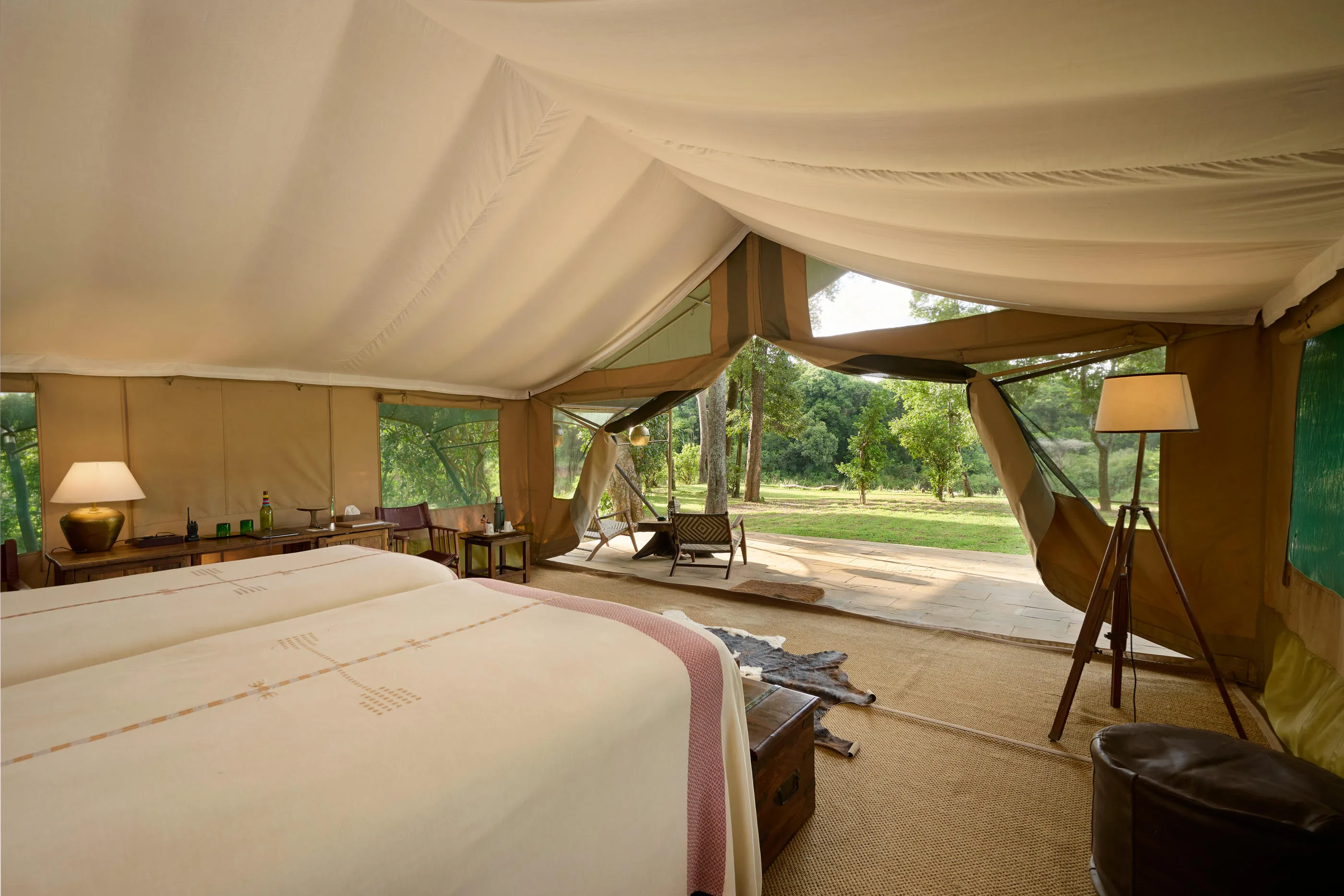 The camp’s ten luxury tents are positioned along the Mara River, each featuring a private veranda and en-suite bathroom. Tents are generously furnished and include standalone bathtubs, showers, twin basins, flush toilets, and hot and cold running water, delivering comfort while maintaining a strong connection to the surrounding wilderness. Elevated verandas offer excellent wildlife viewing, with elephants, hippos, and other species often visible just outside.