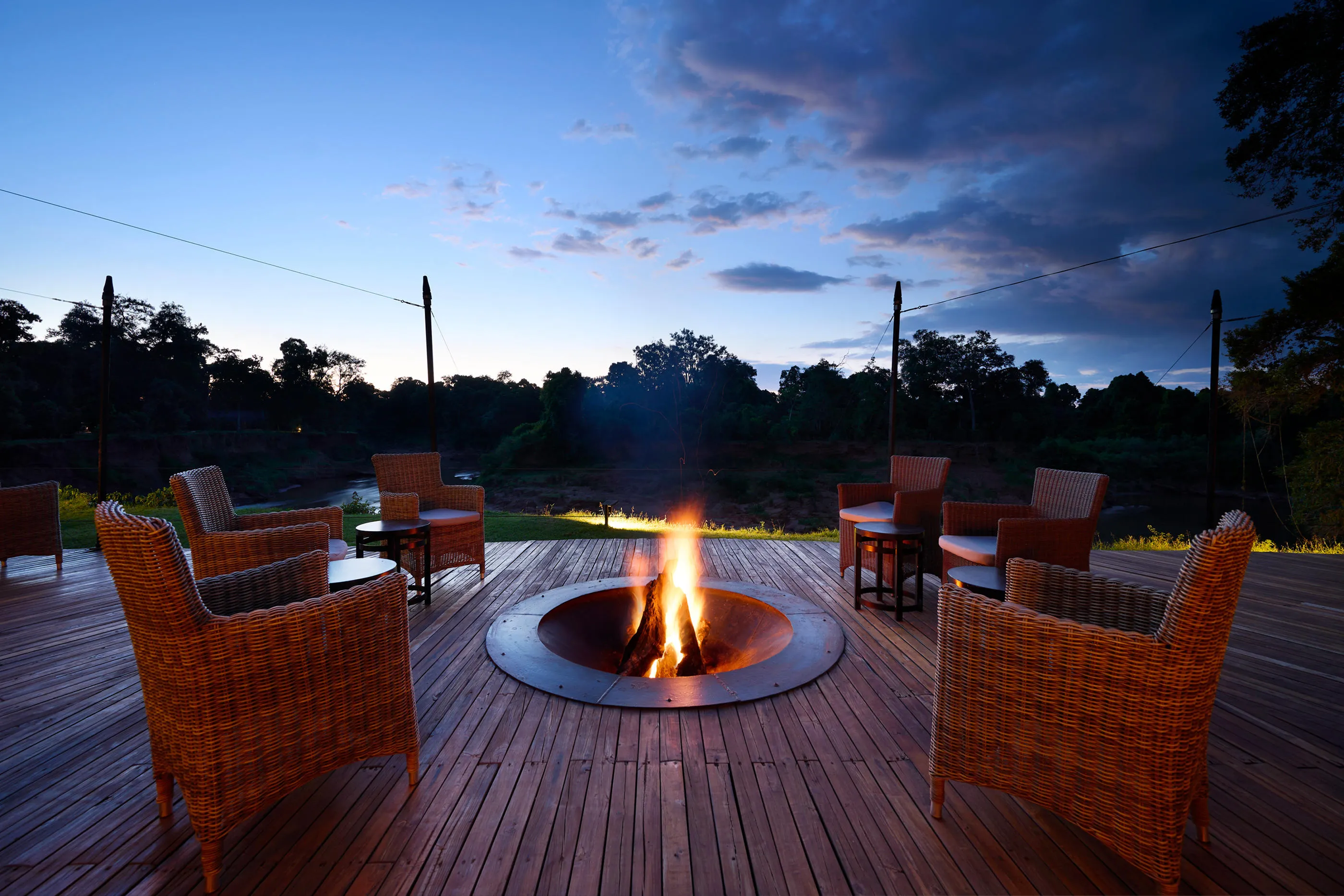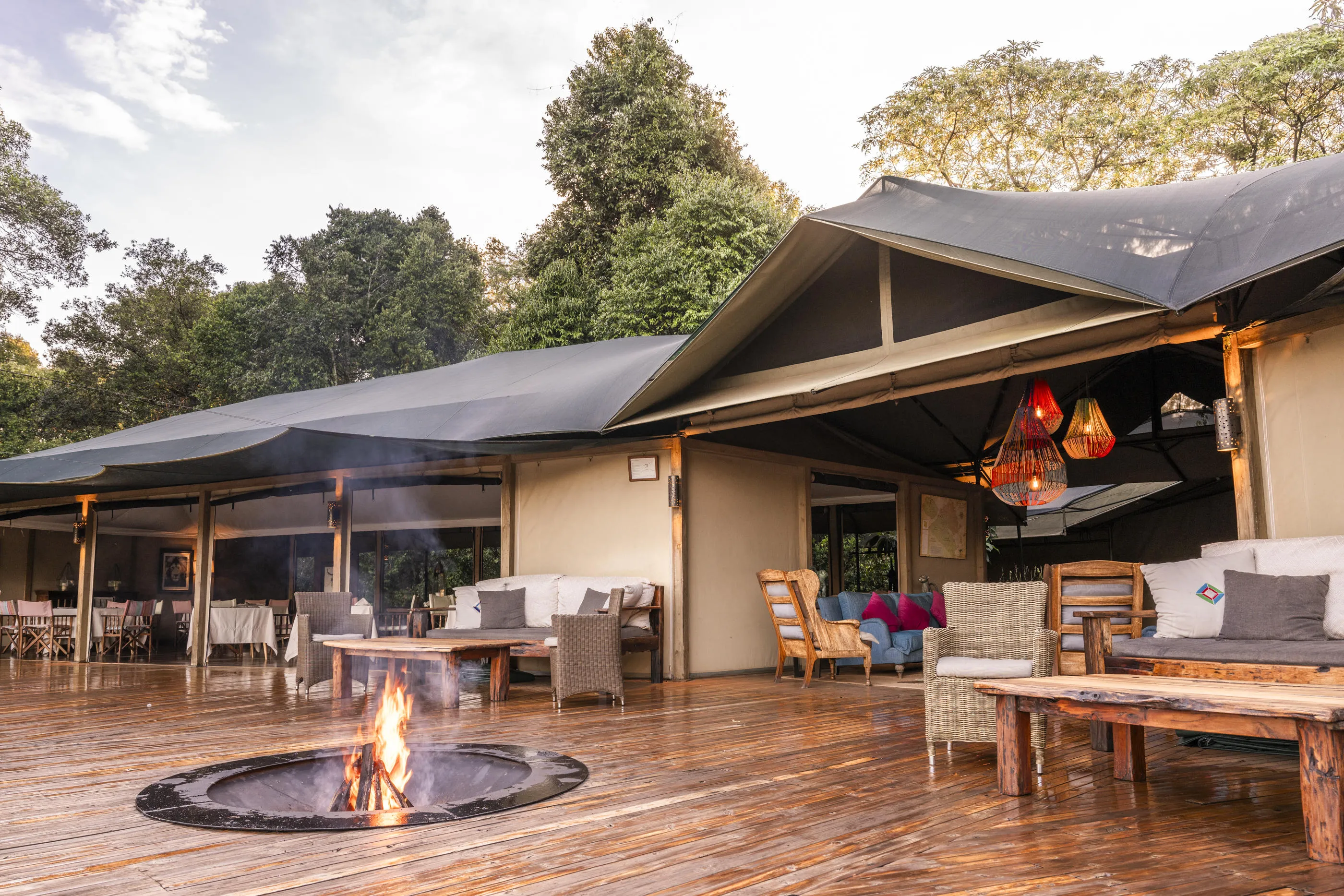 Dining at Il Moran Camp is relaxed yet refined, with meals served on the raised deck of the main mess overlooking the Mara River. Breakfast offers continental and full English options, while lunch is plated with fresh, seasonal ingredients. Dinner combines buffets and plated service, and guests can arrange bush picnics or sundowners by the river. A central sunken fire pit provides a convivial spot to enjoy drinks beneath the African sky.