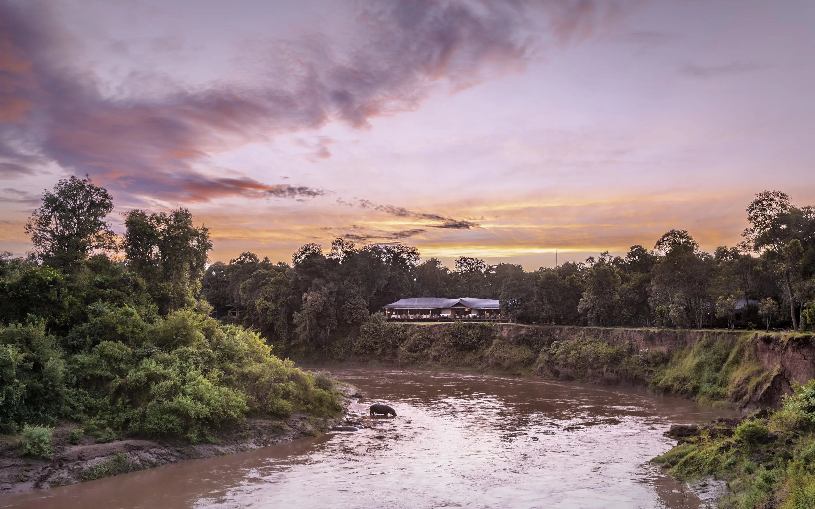 Governors’ Il Moran Camp is an intimate luxury safari camp set along the banks of the Mara River in the heart of Kenya’s Masai Mara National Reserve. The camp’s elevated position within riverine forest provides panoramic views of the river and surrounding plains, where elephants, hippos, giraffes, and other wildlife roam freely. With just ten beautifully appointed tents, interiors blend classic safari style with African artistry, offering an atmosphere that is both adventurous and refined. The camp also holds a Gold sustainability rating from Eco‑Tourism Kenya, reflecting its commitment to responsible tourism and conservation.