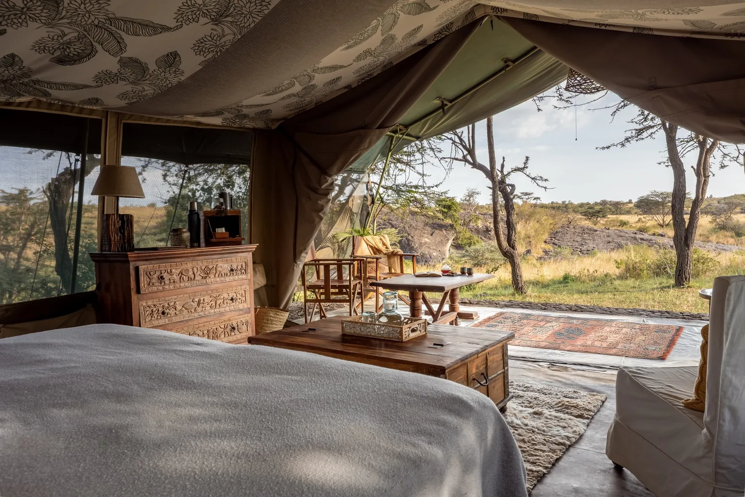 The camp features six Luxury Tents, one Family Suite, and one Private Suite. Each tent is elegantly furnished with natural materials, offering spacious interiors that blend classic safari charm with modern comforts. The Family Suite comprises two en-suite bedrooms connected by a central lounge, providing ample space for families or small groups. The Private Suite offers a two-bedroom retreat with a lounge and verandah, ideal for those seeking seclusion and extra space. All accommodations are designed to harmonize with the surrounding landscape, providing guests with a peaceful and immersive experience.